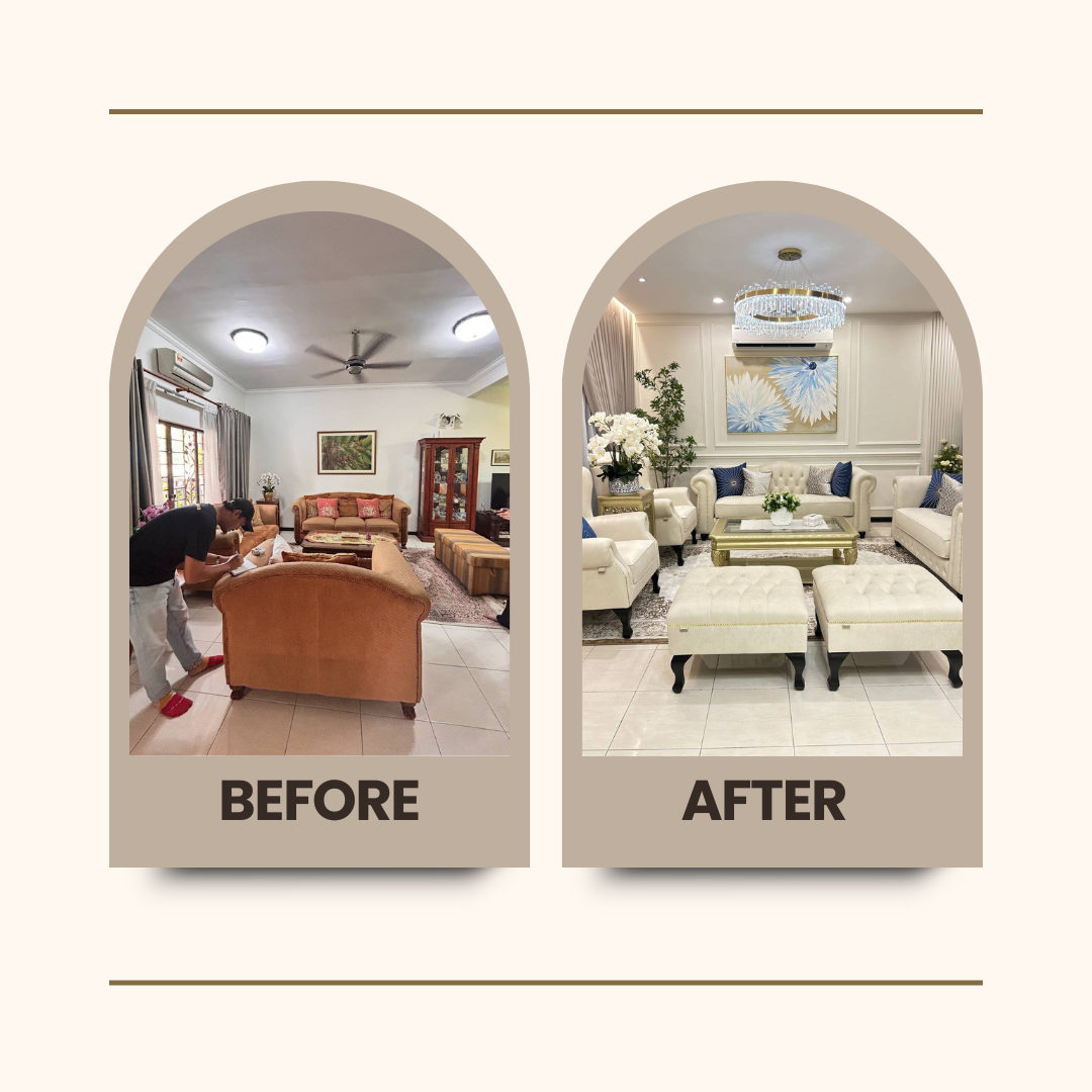 JOB DECO CIKGU SAMSIAH NILAI, JOB SKOP REFURBISHED SOFA GRAND MIRROR WALL REPAINTING NEW CHANDELIER CONSEAL WIRING NEW FURNITURE , CARPET & ACCESSORIES CURTAINS